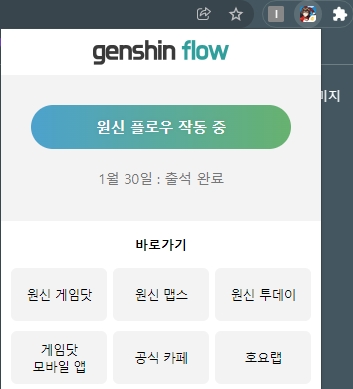 출석 체크가 되었는지의 여부는 브라우저 오른쪽 상단 확장 프로그램 목록에서 원신 플로우를 클릭하여 알 수 있습니다.
